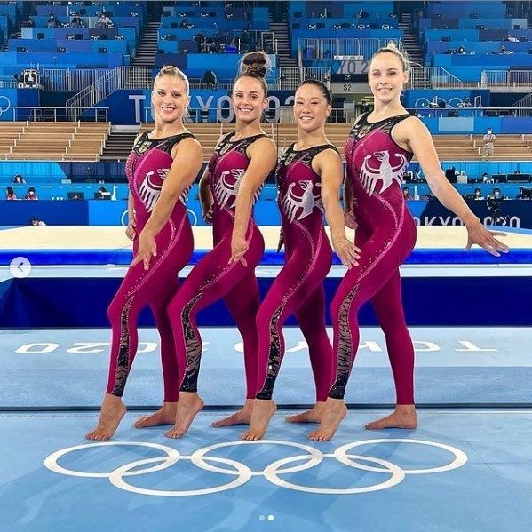 As atletas usaram uma roupa que combina collants e leggings que se estende aos tornozelos nos treinos em Tóquio. Elas podem escolher vesti-los novamente quando as competições começarem. Imagem publicada por Elisabeth Seitz em um perfil em uma rede social
