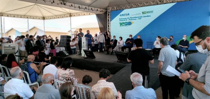 Foram entregues na manhã desta quarta-feira (29) 500 casas no residencial jardim Vitória II, na região sul de Palmas. As habitações foram construídas por meio de uma parceria entre o município e o governo federal, pelo programa Minha Casa Verde e Amarela, com investimento de R$ 40 milhões. Durante o evento foi registrada aglomeração e desrespeito ao uso de máscaras.