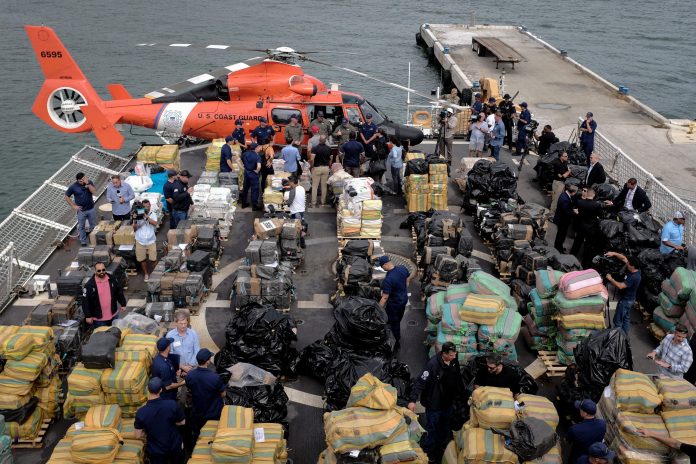 25 apreensões no oceano pacífico oriental e no Mar do Caribe somam mais de 24 toneladas de cocaína e 7 de maconha. Guarda costeira descarrega mais de 30 toneladas de drogas apreendidas em porto da Flórida