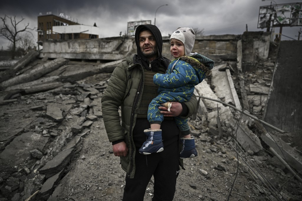 Operação russa já obrigou mais de 5 milhões de ucranianos a saírem de seu país, além de deixar milhares de mortos. Não há fim à vista para os combates. 7 de março – Homem segura crianças durante fuga da cidade de Irpin, a oeste de Kiev, na Ucrânia