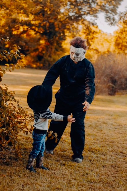 Vestido de cowboy, ele participava de uma sessão de fotos quando seu pai aparece de surpresa vestido de Michael Myers – o grande vilão da franquia de filmes “Halloween”.