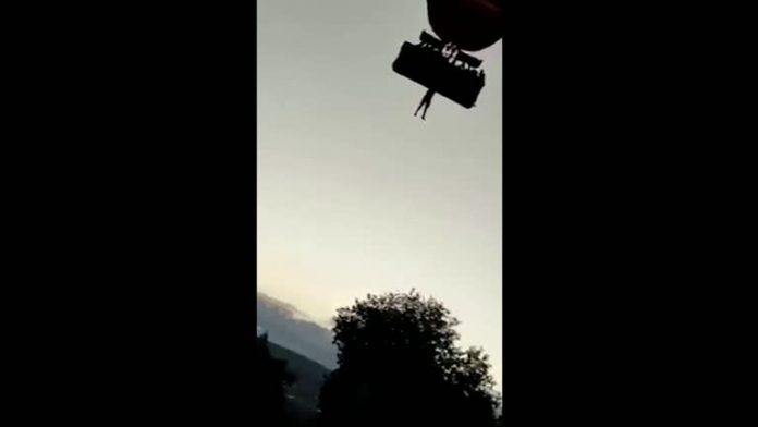 Um motorista que passava pela área flagrou o momento exato em que a vítima ficou suspensa, apenas segurando o cesto do balão com os braços, segundos antes de se soltar.