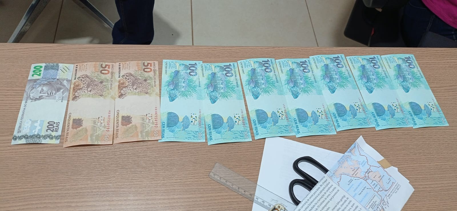 Com o casal foram encontradas dez notas falsas, totalizando R$ 1 mil. Eram sete cédulas com valor de R$ 100, duas de R$ 50 e uma de R$ 200.