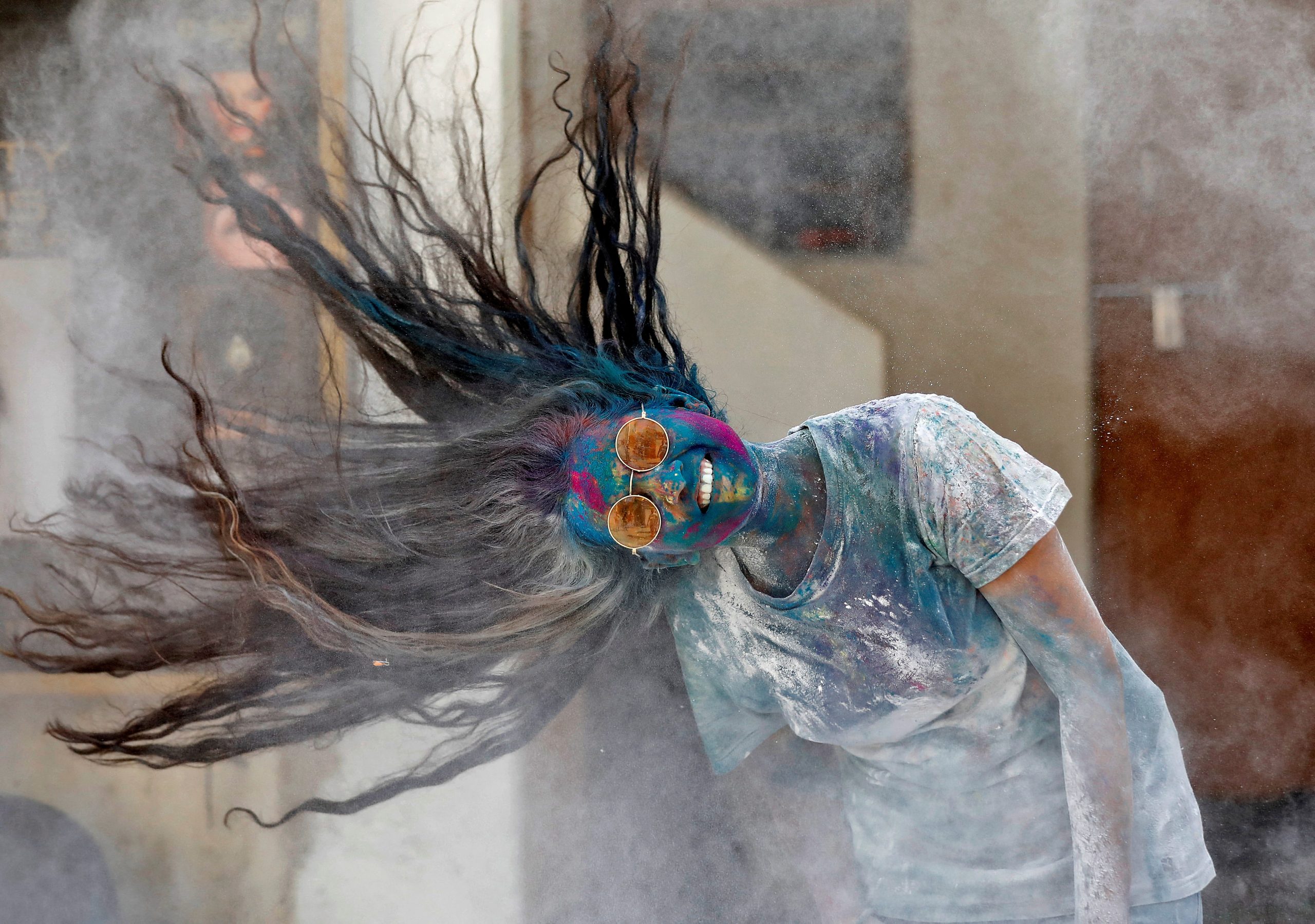 Uma mulher pintada balança a cabeça para remover o pó colorido durante as celebrações do Holi em Mumbai, Índia, em 18 de março de 2022