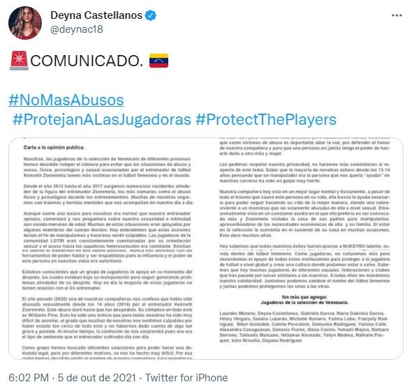 Uma das atletas relatou que os abusos começaram quando ela ainda tinha 14 anos. Treinador dirigia as seleções femininas de base. Jogadora venezuelana Deyna Castellanos publica comunicado sobre assédio contra atletas por parte de treinador