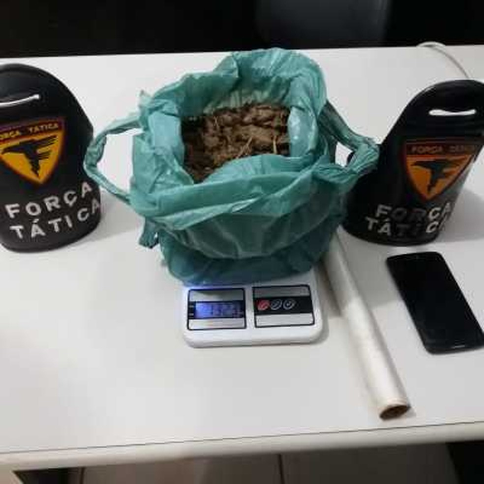 Segundo a PM, além de mais de 1,3 kg de maconha, uma balança de precisão, um plástico usado para embalar a droga e um celular sem nota fiscal foram apreendidos.