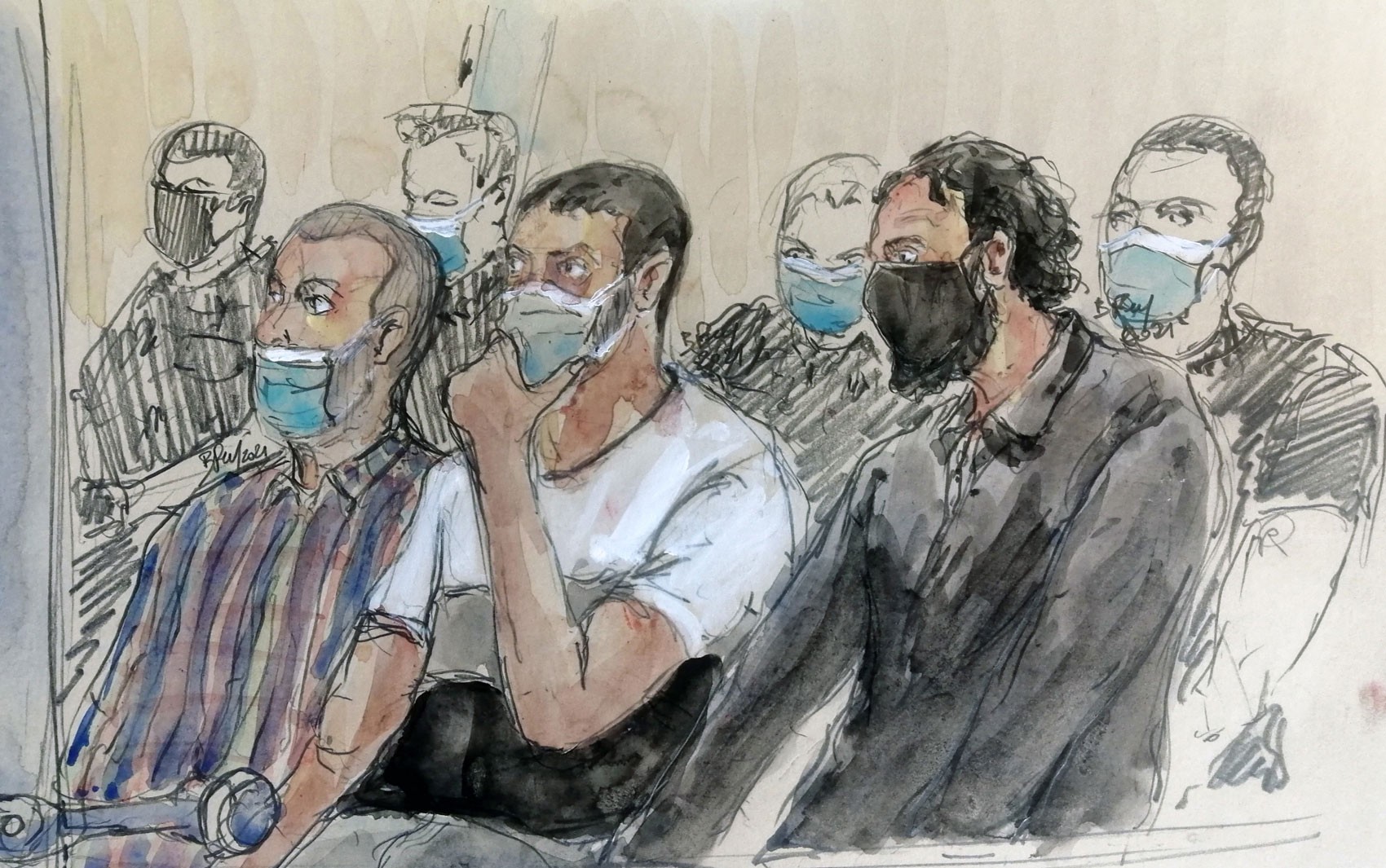 Representação dos acusados no processo dos atentados coordenados de 13 de novembro de 2015 em Paris, entre eles, Salah Abdeslam, o primeiro da esquerda para a direita