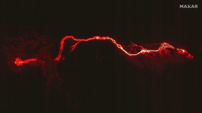 Agora, um novo rio de lava incandescente serpenteia colina abaixo a partir da nova fissura, que se abriu na noite de quinta-feira (30) a cerca de 400 metros ao norte do local da primeira erupção.
