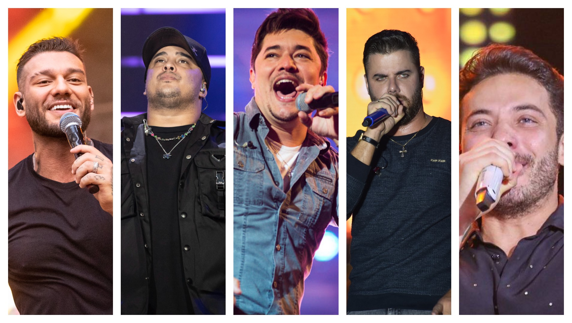 Veja na reportagem relato dos cantores sobre ansiedade e depressão. Pesquisa aponta que preocupação dos brasileiros com tema quase triplicou em um intervalo de quatro anos. A partir da esquerda: Lucas Lucco, Kauan, George Henrique, Zé Neto e Wesley Safadão