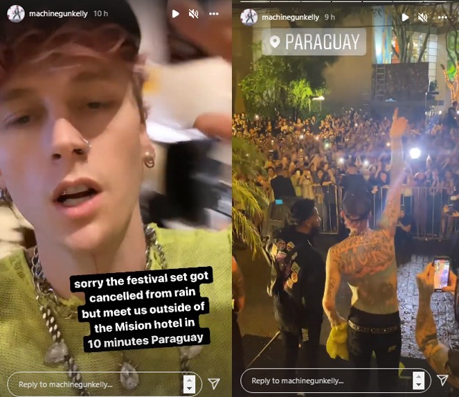 Rapper anunciou em seu Instagram que se reuniria com fãs após Asunciónico cancelar evento por causa das condições climáticas. Machine Gun Kelly faz show para fãs em hotel após festival no Paraguai ser cancelado por causa da chuva