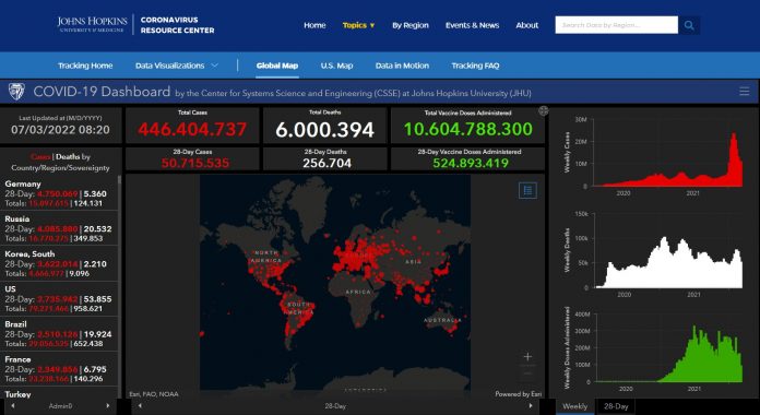 Monitoramento é da Johns Hopkins; especialistas dizem que subnotificação é provável e que a doença se tornou uma de ‘não vacinados’. Reprodução da página da Universidade Johns Hopkins, nos Estados Unidos, que aponta mais de 6 milhões de mortes pela Covid-19.