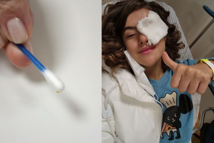 Na noite desta segunda-feira (29), a apresentadora compartilhou nas redes sociais uma imagem em que aparece com gaze nos olhos. Em outro clique, mostrou um cotonete com o que foi retirado de seu olho.