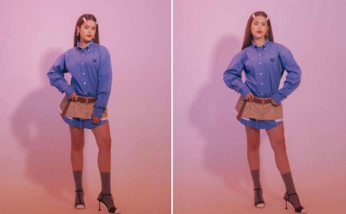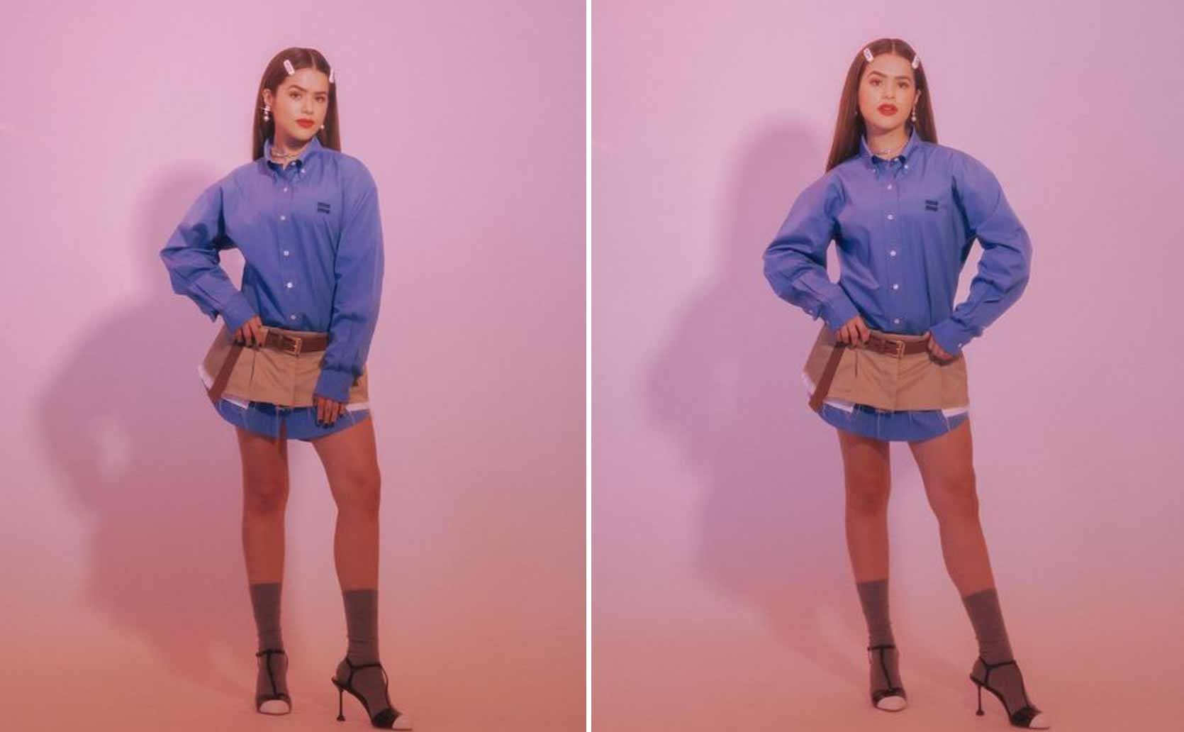 Atriz estava com uma sobreposição de camisa e saia curta. Figurino foi mostrado em desfile da marca em Paris, no ano passado. Maisa usa Miu Miu para o ‘Altas Horas’