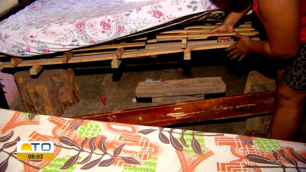 Ana Beatriz dorme em cama improvisada, feita com tocos de madeira e pallet