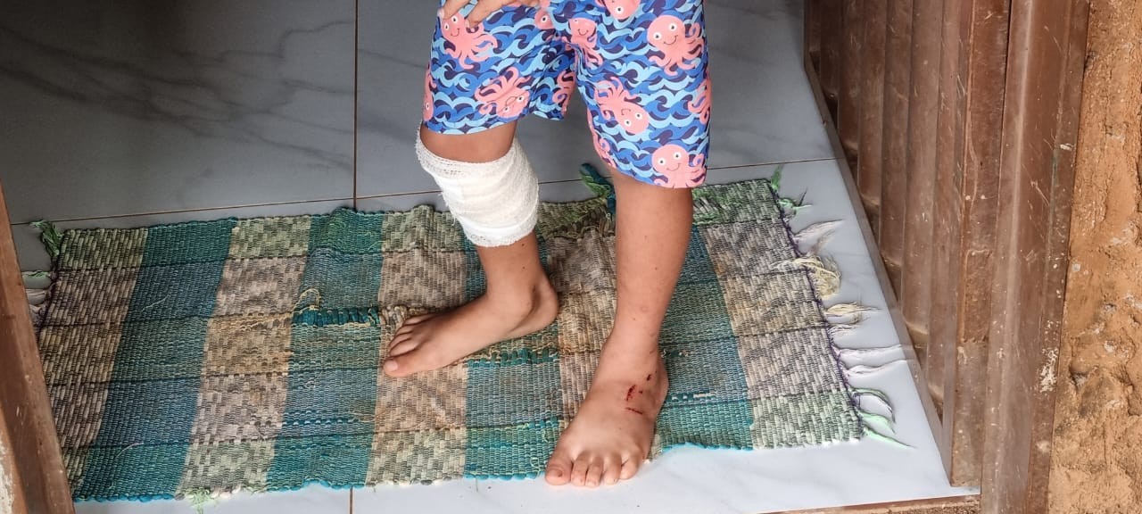 O menino Carlos Daniel Araújo Cardoso, de 5 anos, atropelado junto com os irmãos na porta de casa, na última sexta-feira (18), mostra os vários ferimentos espalhados pelo corpo. Ele chegou a ser encaminhado para a Unidade de Pronto Atendimento Sul, em Palmas, mas já recebeu alta hospitalar e se recupera em casa.
