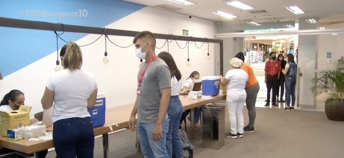 Equipe de saúde do município foi até o shopping Capim Dourado para incentivar a imunização da comunidade. Aplicação das doses segue até às 20h deste sábado (30). Shopping de Palmas é ponto de vacinação da Covid-19 e gripe neste sábado (30), até as 20h