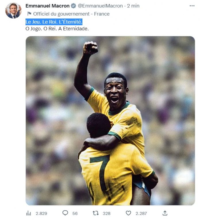 Presidente da França, Emmanuel Macron, lamenta morte de Pelé.