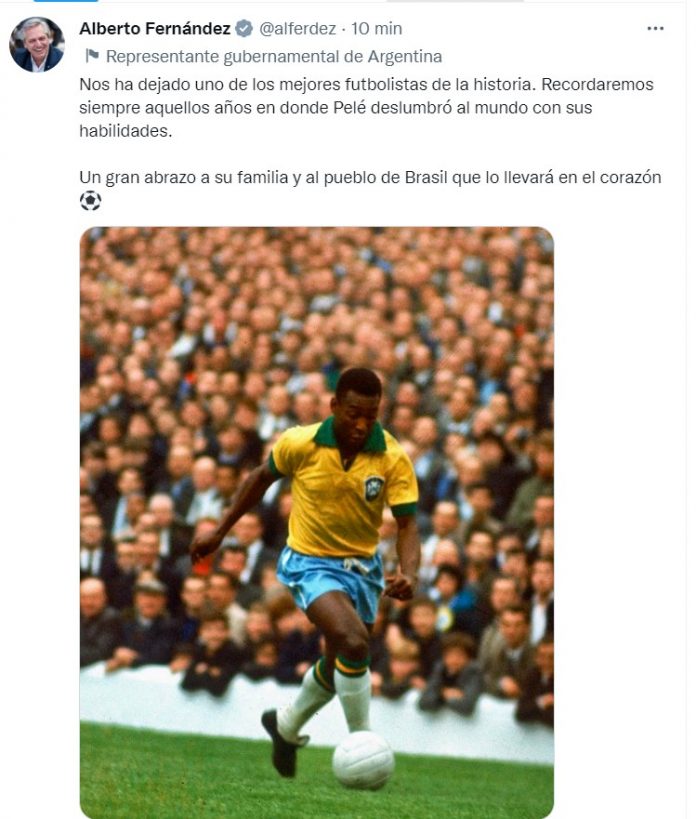 “Um dos melhores jogadores de futebol da História nos deixou. Lembraremos sempre daqueles anos em que Pelé deslumbrou o mundo com suas habilidades. Um grande abraço a sua família e ao povo brasileiro que o levará no coração”, escreveu Fernández em sua conta no Twitter.