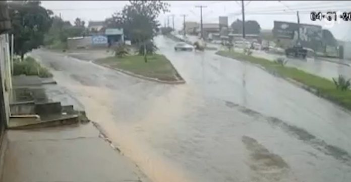 Acidente aconteceu em avenida de Paraíso do Tocantins e foi registrado por uma câmera de segurança. Chovia bastante no momento do acidente. Momento em que a motociclista é derrubada por carro em Paraíso do Tocantins