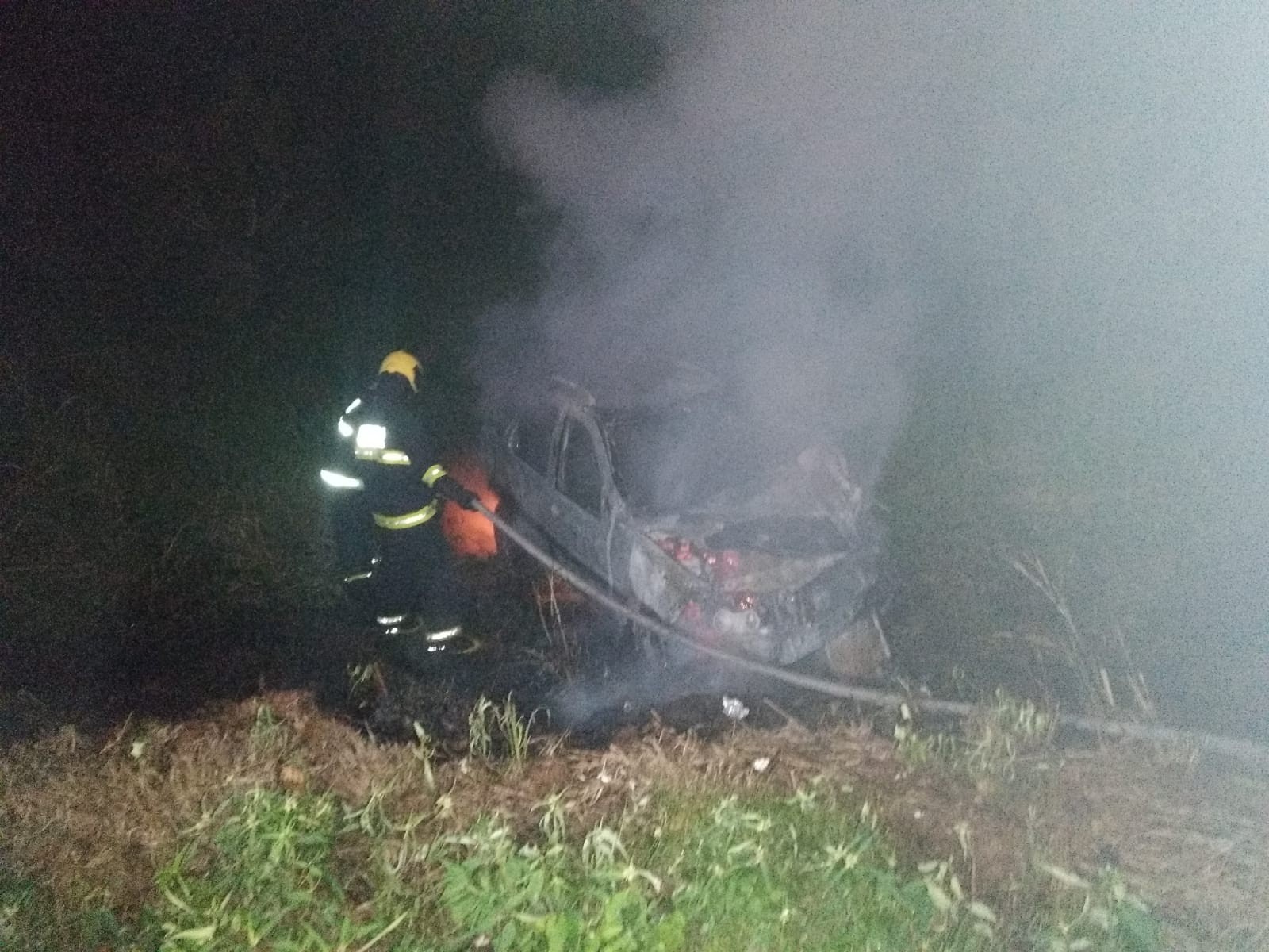 A moto em que as vítimas estavam e o carro do outro envolvido no acidente pegaram fogo após a colisão e chamas foram controladas pelos bombeiros. Bombeiros controlaram chamas após acidente com duas mortes