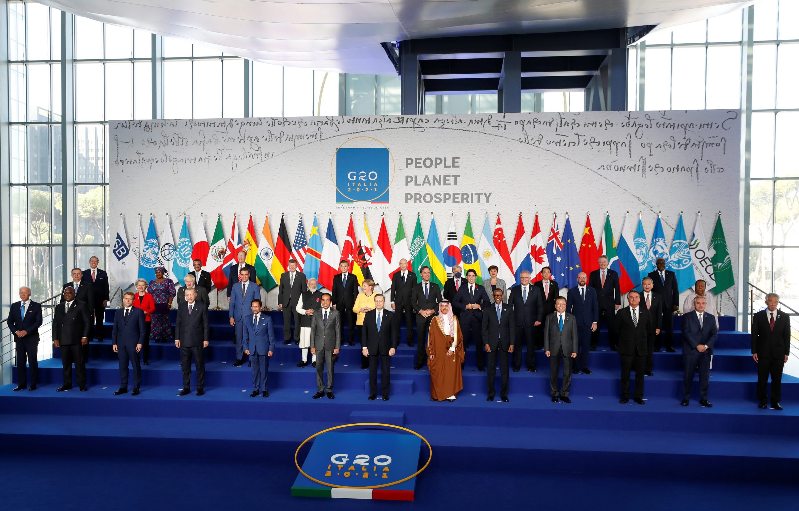 Os presidentes da China e da Rússia não foram ao encontro em Roma. Líderes de países do G20 em foto de 30 de outubro de 2021; Jair Bolsonaro é o antepenúltimo, da esquerda para a direita, na primeira fileira