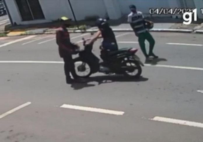 Uma mulher teve a moto roubada por dois criminosos ao parar no semáforo de um cruzamento em Araguaína, no norte do Tocantins. O crime aconteceu na tarde desta segunda-feira (4), por volta das 13h30, e foi gravado por câmeras de comércios. Ninguém foi preso.
