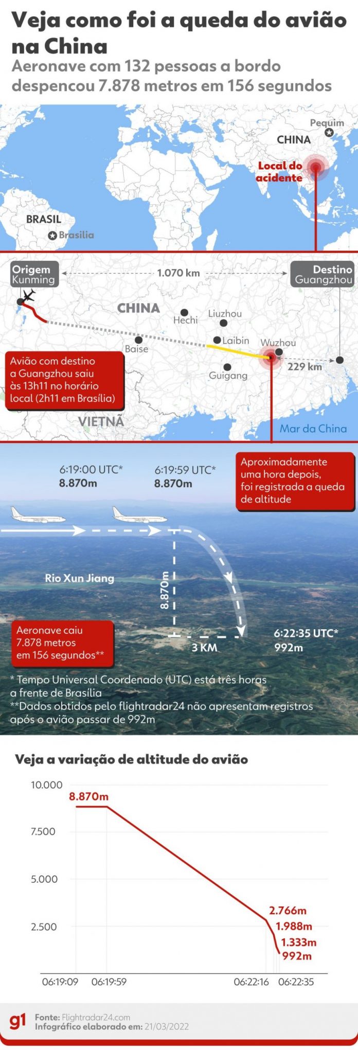 Um avião do modelo Boeing 737-800 da China Eastern Airlines caiu na segunda-feira (21) no sul da China. A aeronave transportava 132 pessoas de Kunming para Guangzhou. Rastreador de voo mostra trajeto de avião da China Eastern Airlines antes de acidente