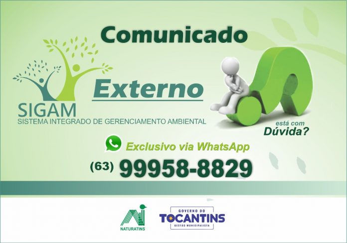Em fase de implantação pelo Instituto Natureza do Tocantins (Naturatins), seu novo sistema operacional, o Sigam (Sistema Eletrônico Integrado de Gerenciamento Ambiental), tem gerado dúvidas em seu público externo. Por isso foram disponibilizados canais de comunicação exclusivos para os usuários tratarem de questões relativas ao Sigam. O atendimento individualizado por ser via WhatsApp (63 99958 8829) ou pelo e-mail sigamnaturatins@gmail.com.