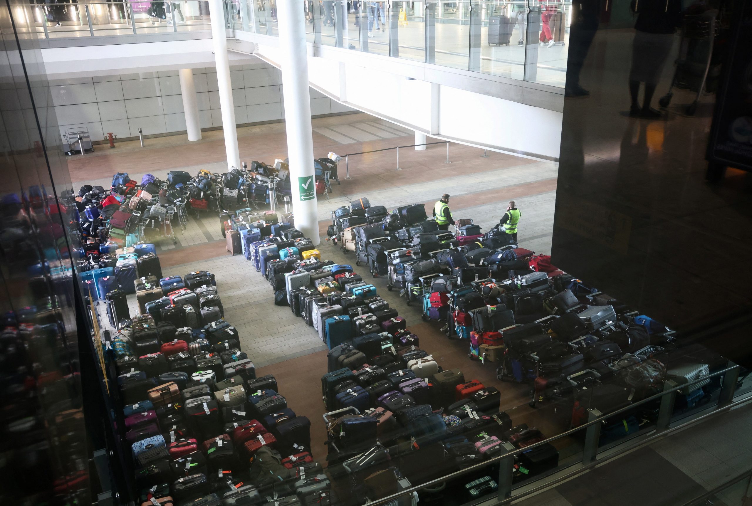 Não há explicação oficial sobre o motivo do problema, mas passageiros ouviram no aeroporto que há falta de trabalhadores. Imagem de malas no aeroporto de Heathrow, em 19 de junho de 2022