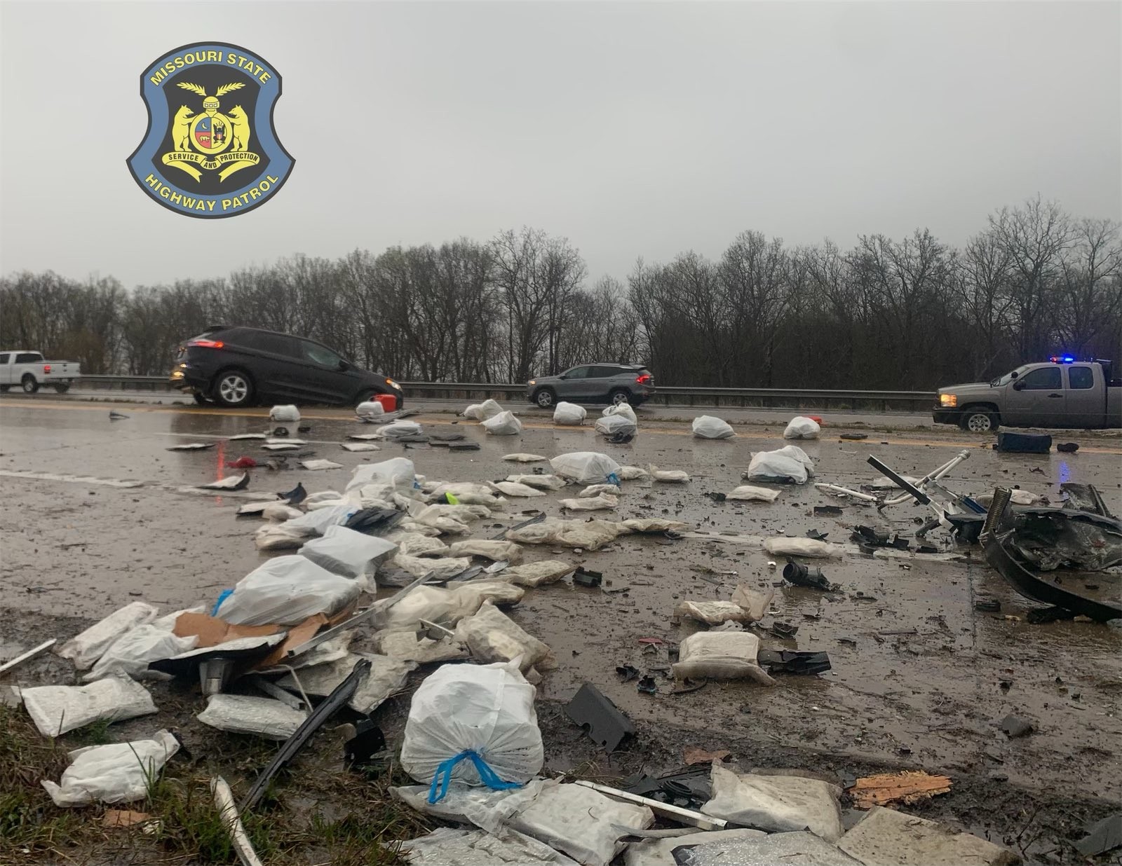 Três pessoas foram presas por tráfico de drogas. A batida ocorreu entre três veículos, ninguém ficou gravemente ferido. Pacotes de maconha em rodovia nos EUA, em 20 de abril de 2022