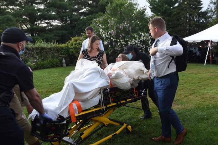 Rebecca Barger, fotógrafa especializada em casamentos, registrou o momento exato em que a noiva é carregada para fora em uma maca – com o vestido e tudo – com o marido ao seu lado.