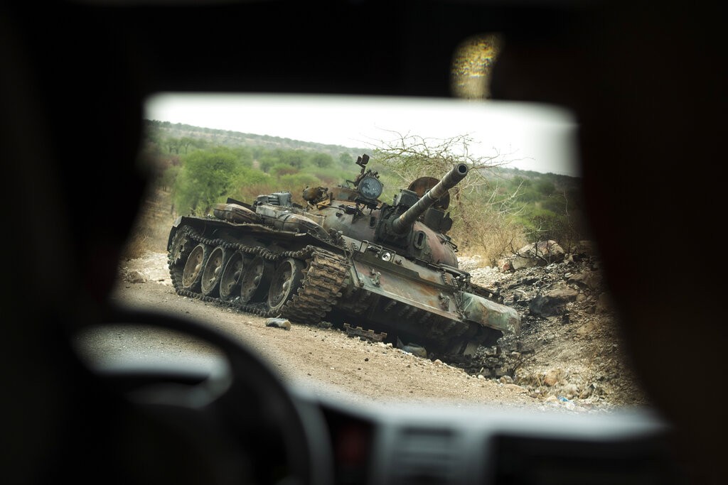 Frente é composta por organizações de diversas regiões da Etiópia e de diferentes etnias do país. Tanque destruído é visto na região do Tigré, na Etiópia, em maio de 2021