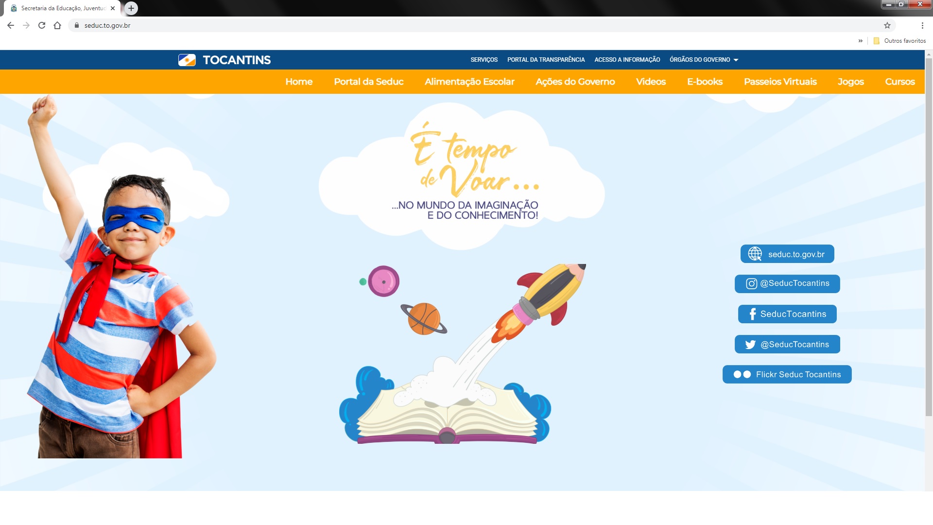 A página, elaborada como uma espécie de “capa” para o site da Seduc, é acessada por meio do mesmo endereço eletrônico da Pasta (www.seduc.to.gov.br) e busca levar estudantes e público em geral em verdadeiras viagens pelo mundo do conhecimento, mas sem sair de casa.
