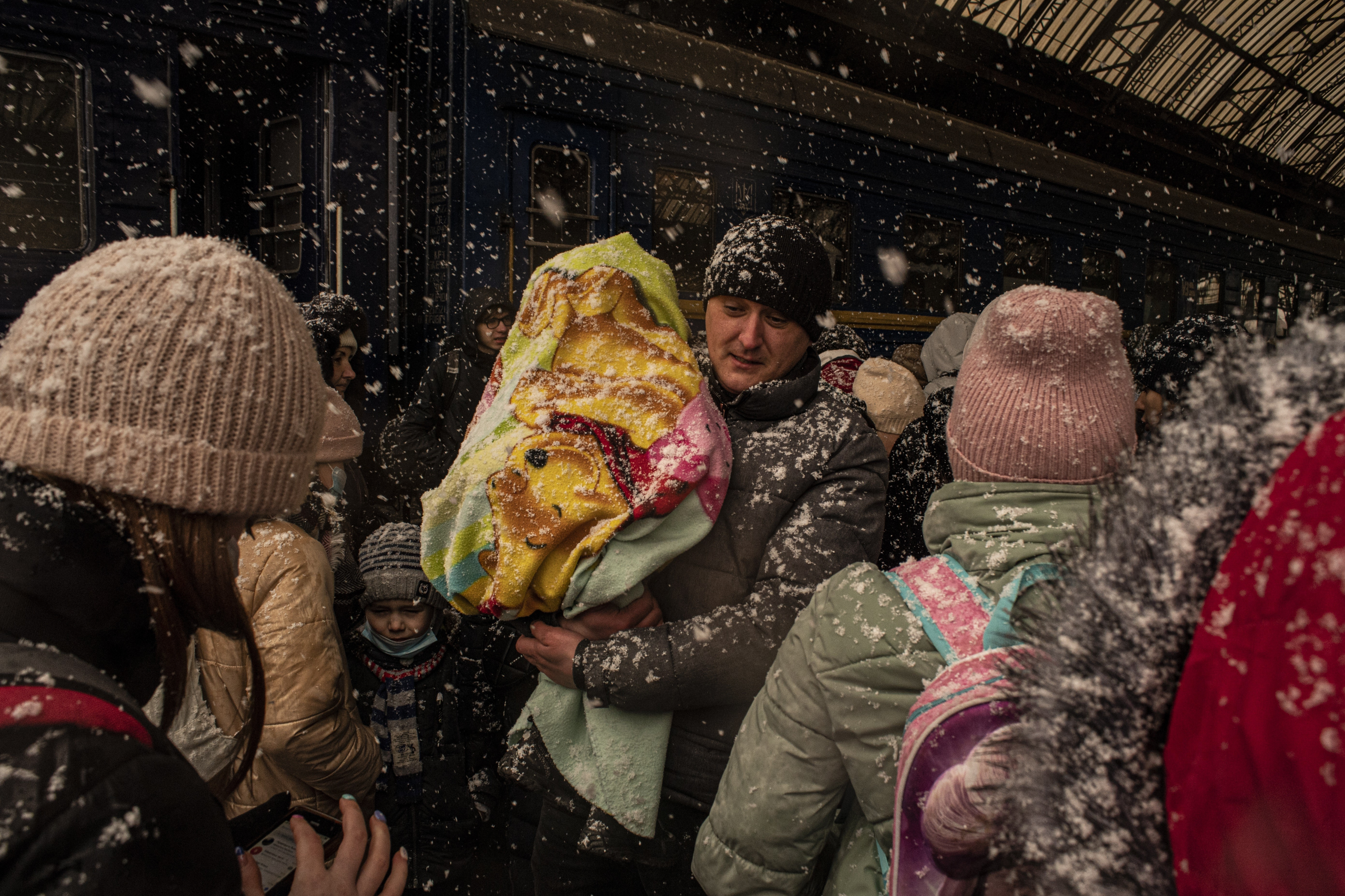 Em Lviv, ucranianos esperam para embarcar em trem para conseguir fugir da Ucrânia