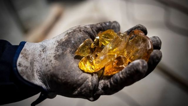 Os produtores enviam a substância para fábricas de destilação, que extraem a terebintina da resina de aparência viscosa e amarelada que solidifica quando resfriada, virando brilhantes pedras âmbar.