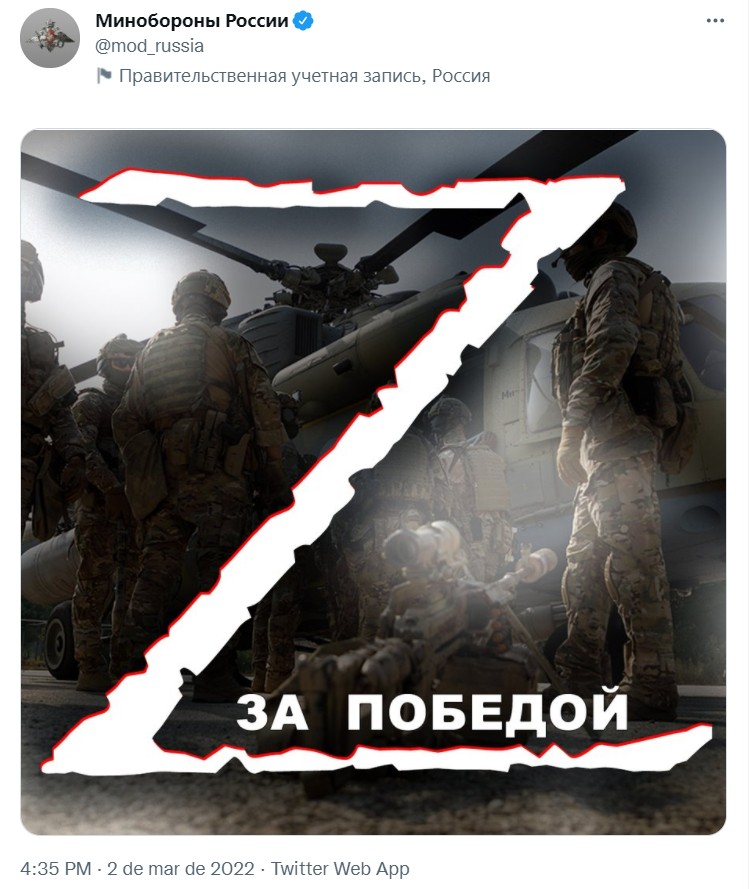 Tuíte do Ministério de Defesa russo com a mensagem “Pela vitória”