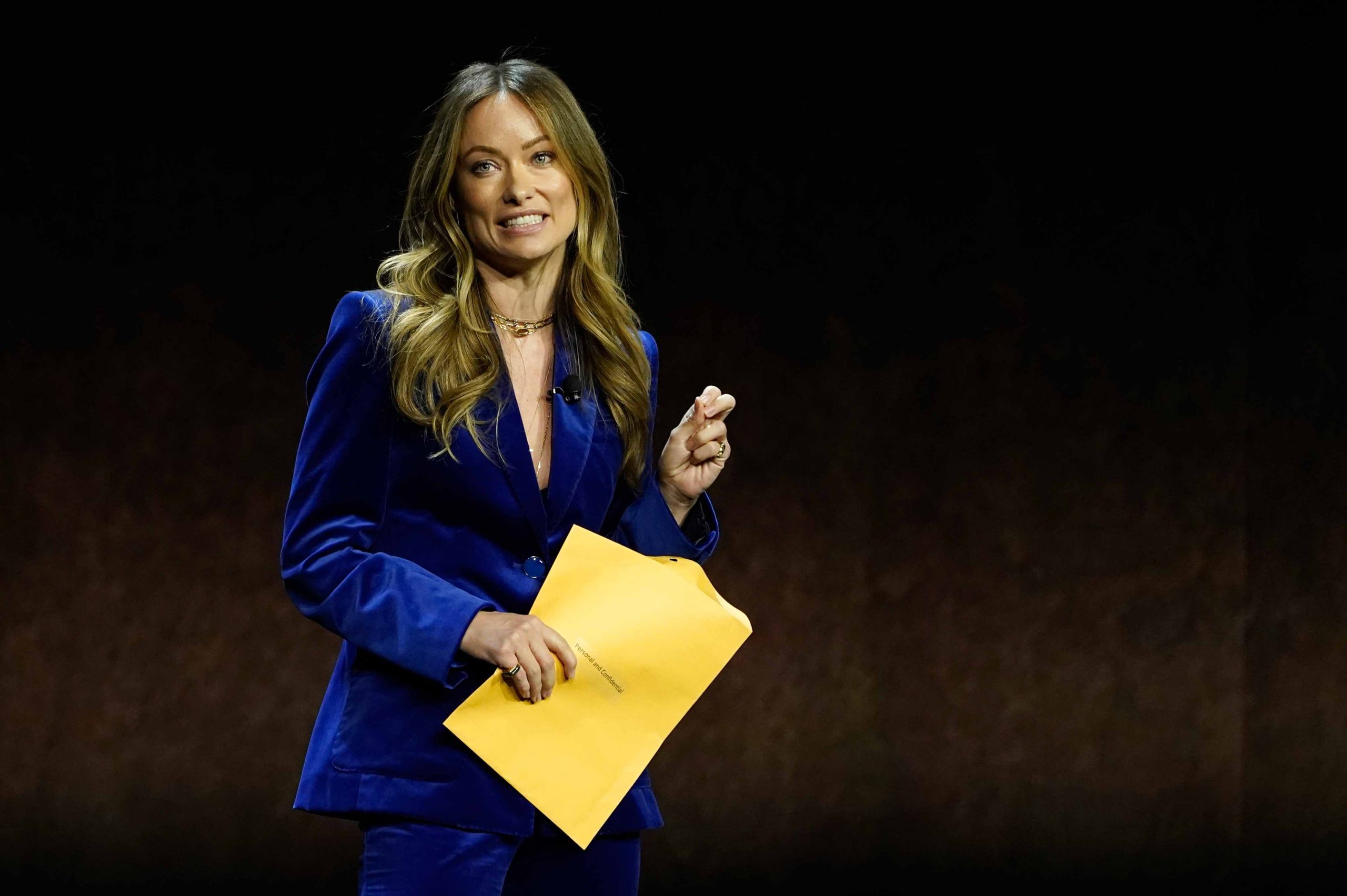 Atriz apresentava pela primeira vez o trailer de seu filme ‘Não se preocupe querida’ quando recebeu o envelope amarelo com as inscrições ‘pessoal e confidencial’. Olivia Wilde