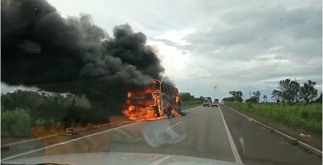 Imagens que circulam nas redes sociais mostram veículo sendo consumido pelas chamas. Passageiros ficaram às margens da rodovia com as bagagens esperando para seguir viagem. Ônibus fica destruído após pegar fogo na BR-153