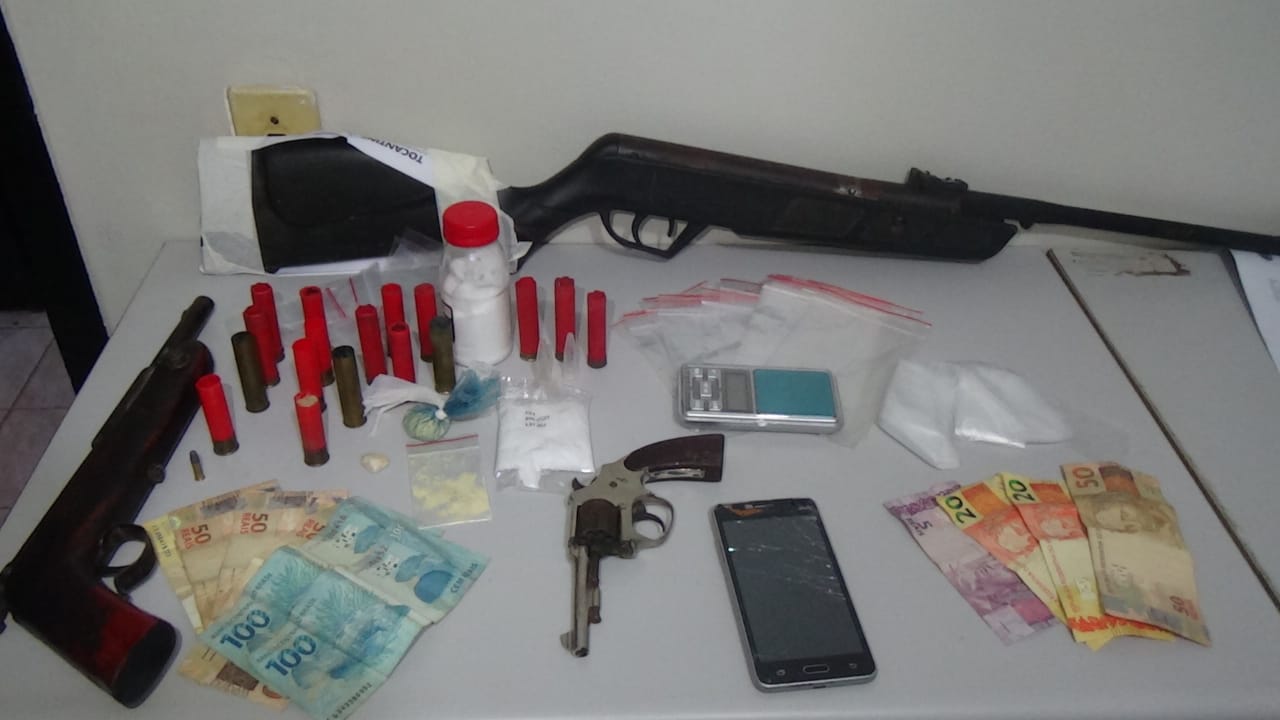 Durante a operação foram apreendidas porções de drogas, armas de fogo e insumos para embalar entorpecentes.