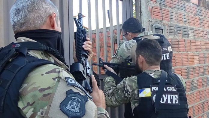 Durante a operação foram apreendidas porções de drogas, armas de fogo e insumos para embalar entorpecentes.