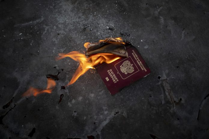 Passaporte russo se incendiando durante protesto na frente da embaixada da Rússia na Lituânia em 24 de fevereiro de 2022, dia em que tropas de Moscou invadiram a Ucrânia.