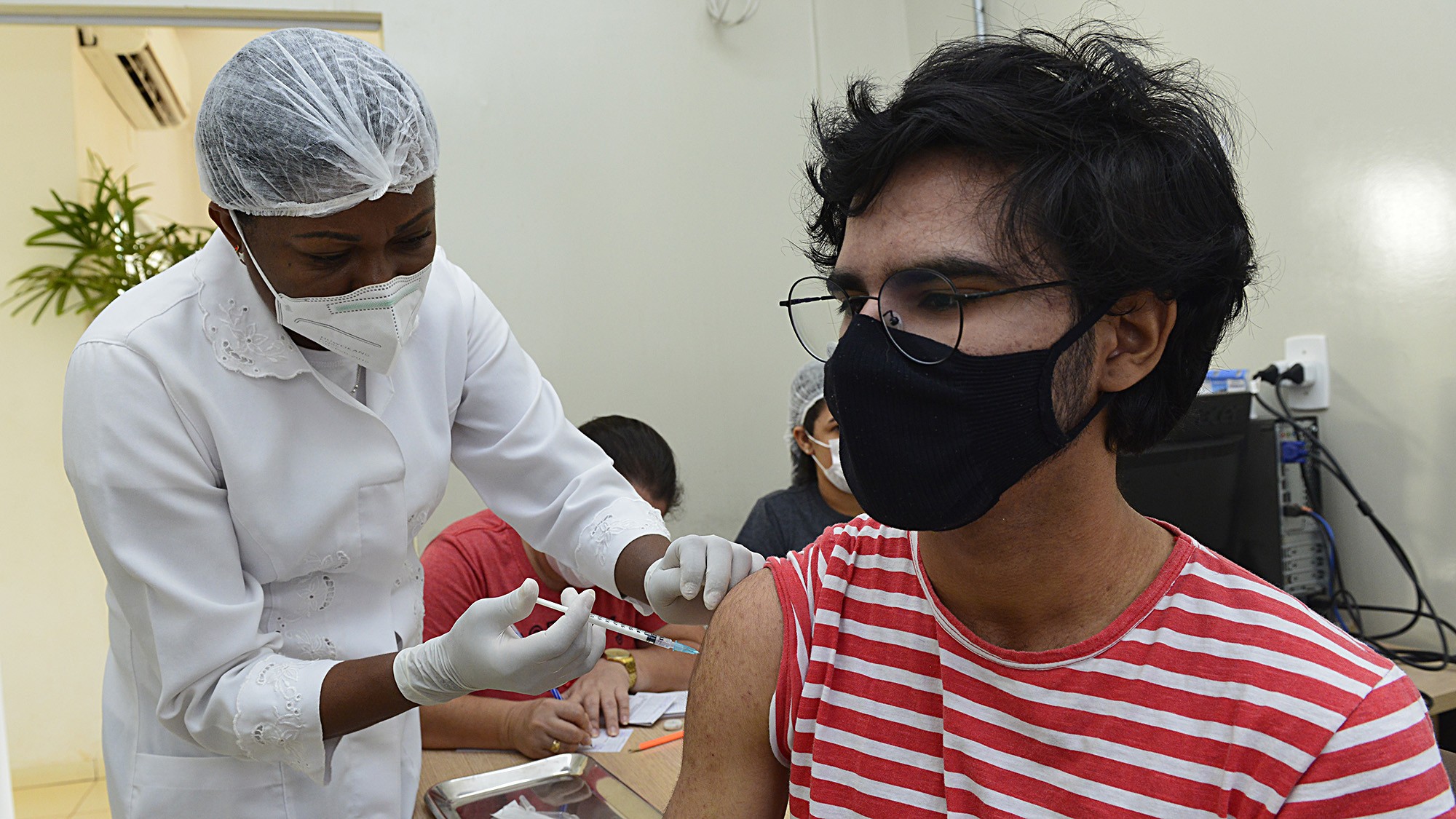 Para receber a dose é preciso fazer o agendamento pela internet. Confira os locais e horário de vacinação. Jovem recebendo vacina contra Covid-19 em Palmas