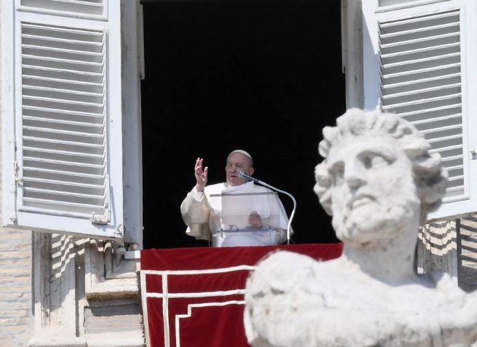 Papa Francisco faz a oração do Angelus dominical da janela de seu escritório com vista para a Praça de São Pedro no Vaticano no dia 6 de março de 2022