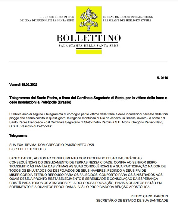 Boletim da Santa Sé com telegrama enviado ao bispo de Petrópolis em solidariedade às vítimas da tragédia