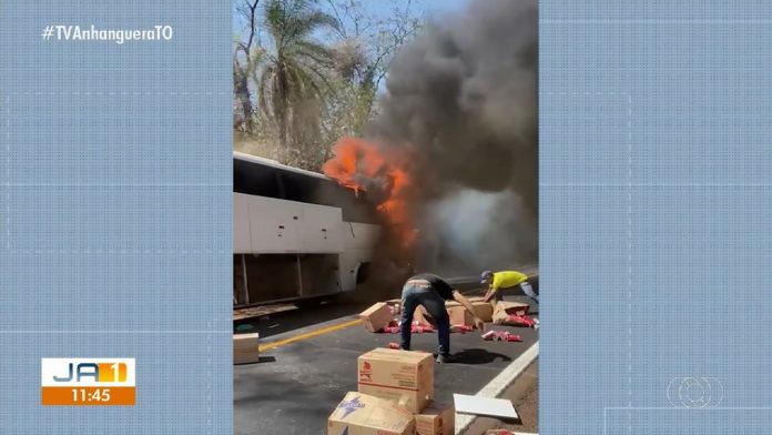 Participe do canal do g1 TO no WhatsApp e receba as notícias no celular.O incêndio aconteceu no quilômetro 505 da rodovia, por volta das 10h. Nas imagens é possível ver uma grande nuvem de fumaça preta e fogo na parte de trás do ônibus.