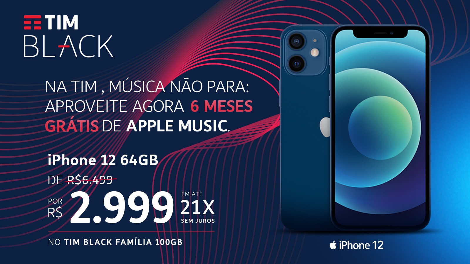 O iPhone 12 sai por R$ 2.999 para quem contratar o TIM Black Família com 100GB de internet.