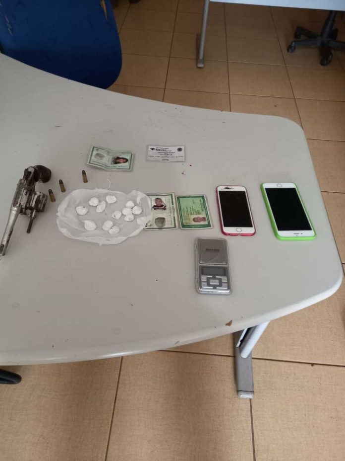 Durante as buscas no interior da residência foram localizados um revólver calibre. 32, três munições intactas, 14 porções de substância análoga à cocaína, uma porção de substância análoga à maconha, uma balança de precisão e partes dos produtos furtados em um comércio da cidade. A mulher de 20 anos se apresentou aos policiais como proprietária do local e o adolescente assumiu a propriedade da arma de fogo e da droga.