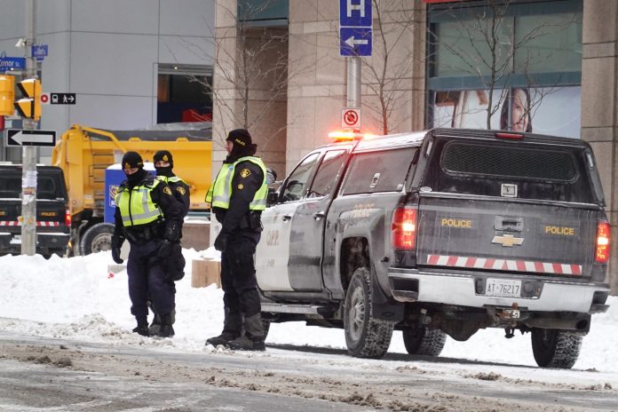 Na manhã deste domingo (20), a polícia vigiava vários postos de controle que restringiam o acesso a uma grande área do centro de Ottawa, enquanto um forte destacamento de forças de segurança ocupava o terreno conquistado pelos caminhoneiros.