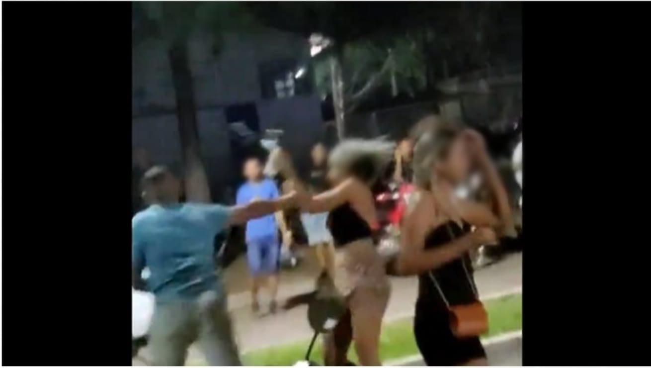 Nas imagens é possível ver o homem parado no meio da rua com duas mulheres e uma lata de bebida na mão. Em determinado momento ele aponta para o rosto de uma das mulheres, segura no pescoço dela e a empurra em direção ao chão.