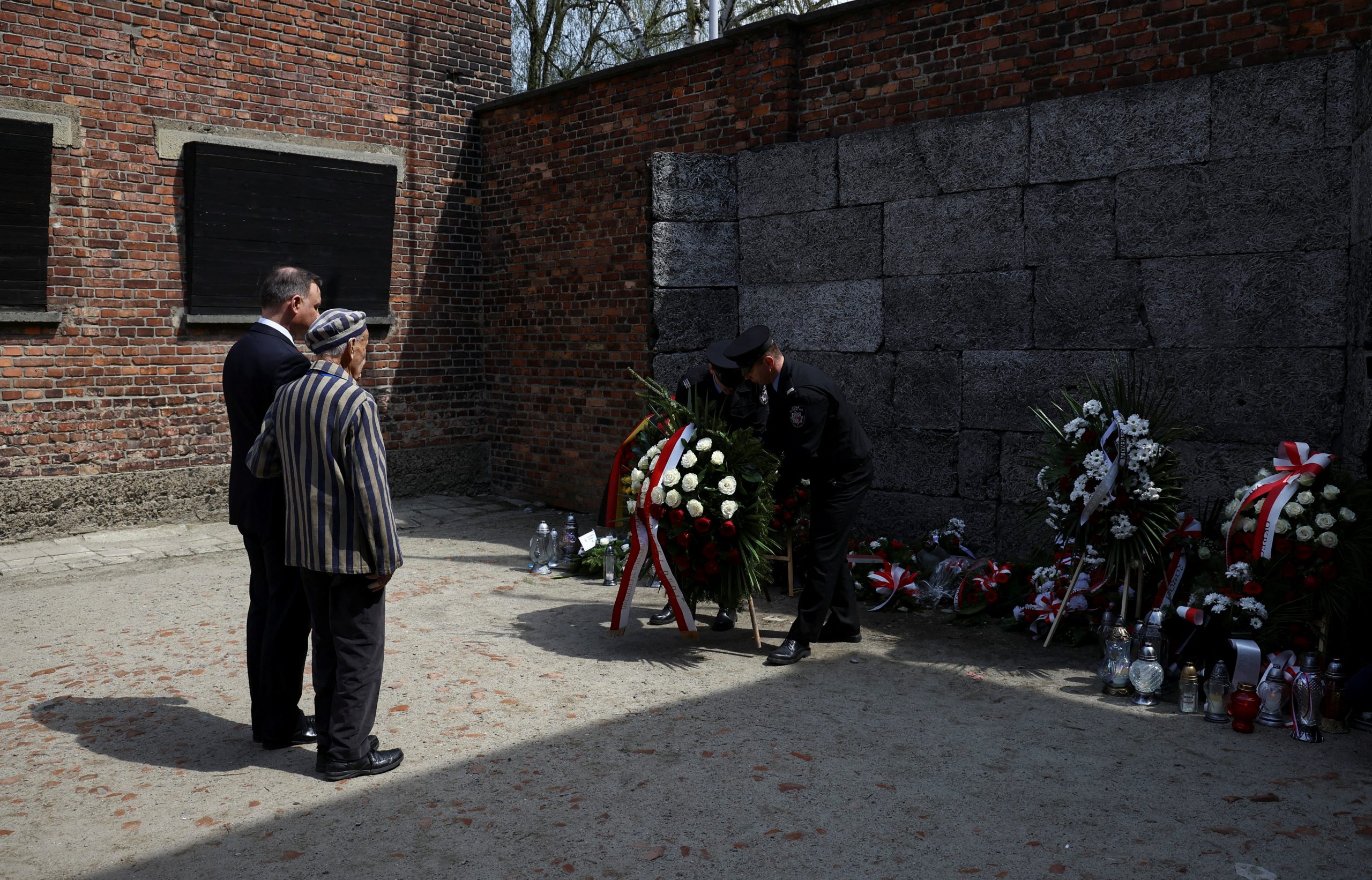 Durante o conflito cerca de 6 milhões de poloneses, sendo eles 3 milhões de judeus, foram mortos pelo Reich. O presidente da Polônia, Andrzej Duda, e o sobrevivente do Holocausto, Edward Mosberg, observam o “Muro da Morte” no antigo campo de concentração de Auschwitz